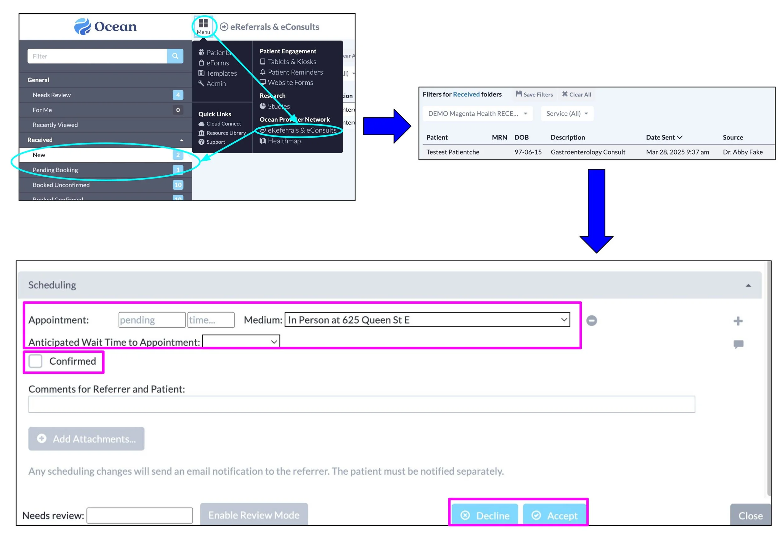 How to “accept” or “decline” or add an appointment date or update approximate wait time or confirm patient appointment in a referral:
